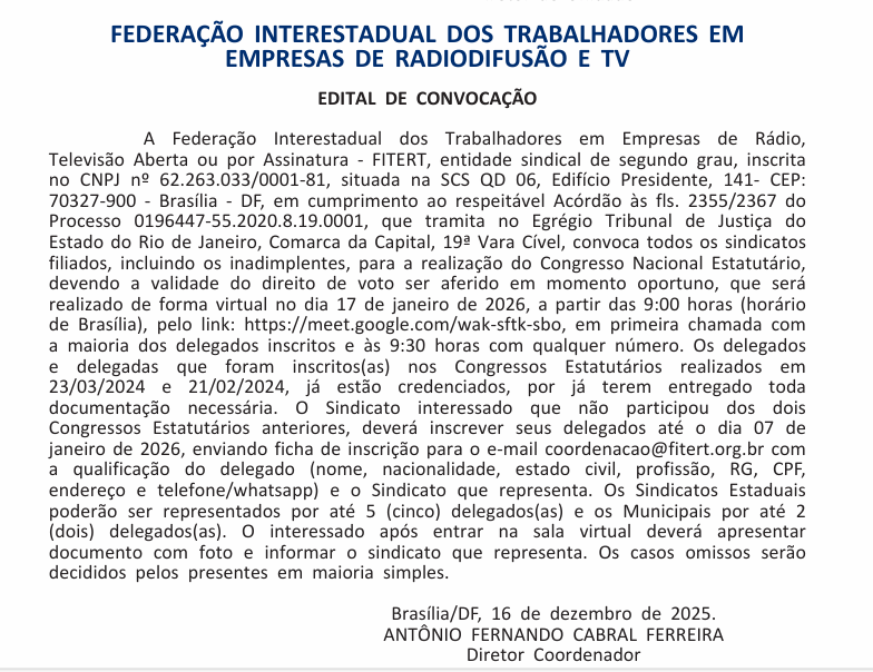 Televisão Aberta ou por Assinatura – FITERT, entidade sindical de segundo grau, inscrita
